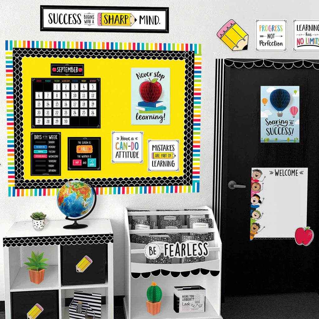 Dress up bulletin boards, rooms, hallways, and common areas with this Black Scallops EZ border. This versatile border is perfect for any decorating theme. These new EZ borders come in smaller strips, which are easier to manage and store. Each package comes with enough borders to complete 2 full bulletin boards.
