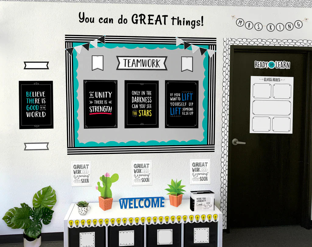 Smart and simple, this Core Decor Black Stripes EZ Border features black and white contrasting, horizontal stripes. Use it alone to create a classic look or layer it with another border for a unique designer look. Perfect for use on bulletin boards in a wide variety of classroom, office, church, and school settings. These new EZ borders come in smaller strips, which are easier to manage and store. Each package comes with enough borders to complete 2 full bulletin boards.