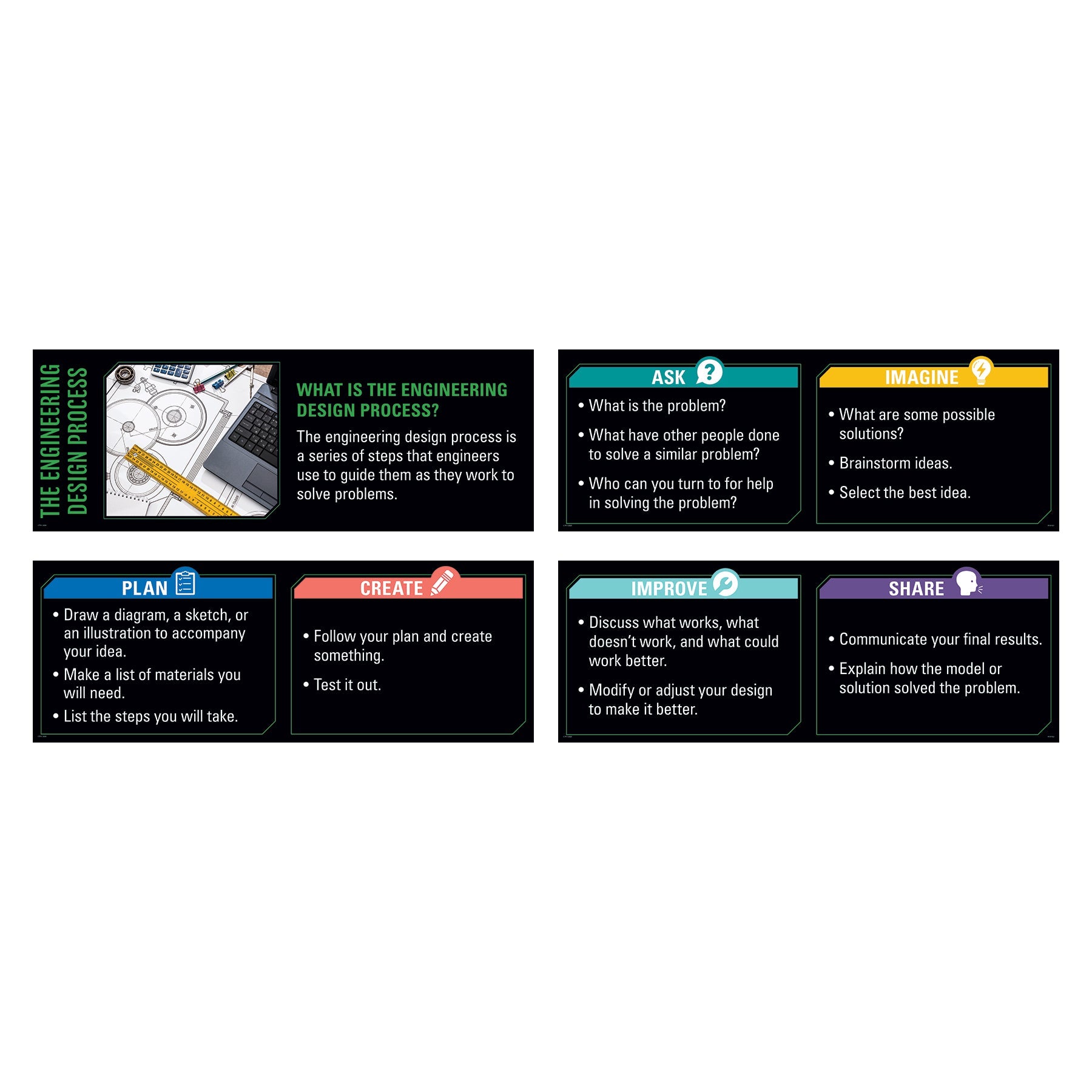 The STEM Whiteboard Toppers focuses on the engineering design process and highlights the steps of the process: ask, imagine, plan, create, improve, and share.