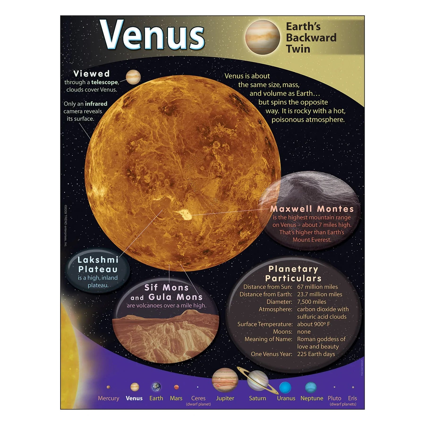Though you can often see it in the night sky, the stunning photo on this chart brings Venus into plain view for an exploration of this planet. Rich content engages viewers and aligns with Learning Standards.